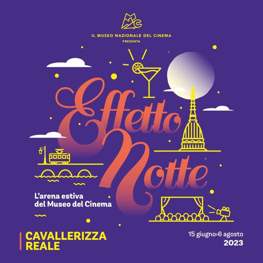 Fino al 6 agosto 2023 alla Cavallerizza Reale (cortile della Manica del Mosca) è stata allestita EFFETTO NOTTE, l’Arena estiva del Museo Nazionale del Cinema, un vero e proprio cinema all’aperto che conta 400 posti e che prosegue idealmente l’attività della Sala Tre del Cinema Massimo.